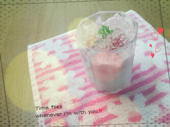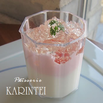 上からゼリー、果物、いちごソース、杏仁豆腐になってて